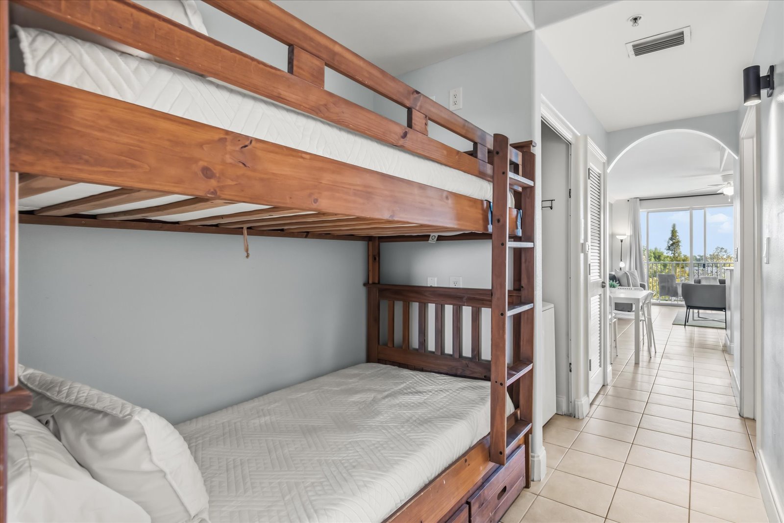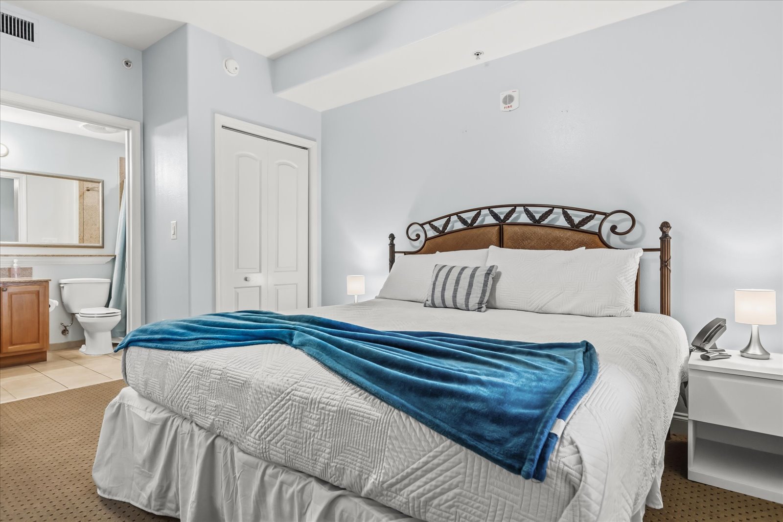 This condo sleeps up to 4 guests and features a king bedroom with ensuite bath, hallway bunk beds, a second full bathroom, and an open kitchen–living–dining area with panoramic lake views. Enjoy a fully equipped kitchen, private balcony, in-unit washer/dryer, WiFi, and free parking.