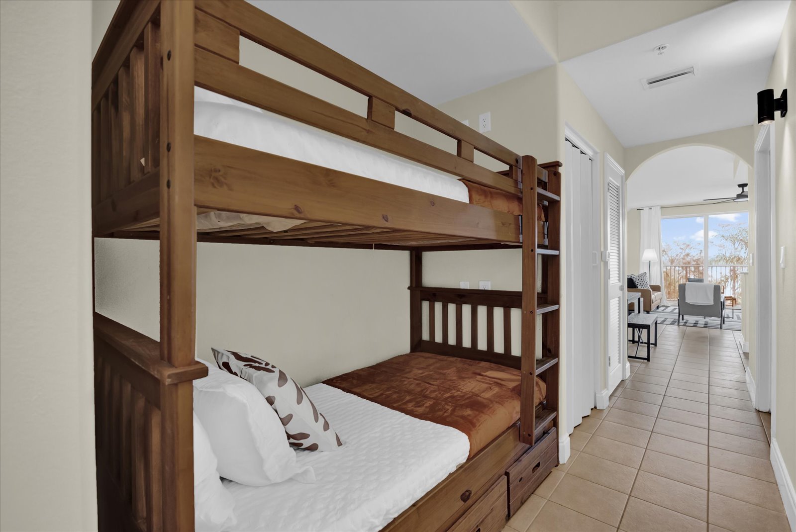 This condo sleeps up to 4 guests and features a king primary bedroom with ensuite bath, hallway bunk beds, a second full bathroom, and an open kitchen–living–dining area with lake views. The unit includes a fully equipped kitchen, private balcony, in-unit washer/dryer, WiFi, and free parking.